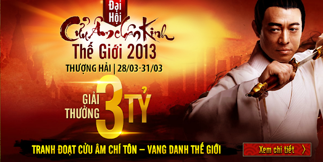 Giải đấu Đại Hội Cửu Âm Chân Kinh Thế Giới 2013 - Nơi cao thủ năm châu hội tụ, tôn vinh nét đẹp võ thuật Phương Đông, phô diễn sự huyền diệu tinh tế của những bộ võ học của Bát đại môn phái. Ngoài cơ hội vang danh trên toàn thế giới, cao thủ đăng quan sẽ sở hữu cho mình danh hiệu Quán Quân Thế Giới 2013 do chính nhà NPH Snail Game trao thưởng, kèm theo đó là số tiền thưởng vô cùng lớn.